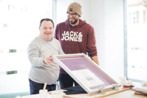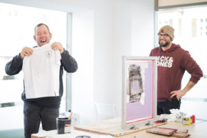 Das Besondere: Die eingangs erwähnte Tür steht hier weit offen – im physischen und im übertragenen Sinn. Denn im Herzstück81 geht es vor allem um Sichtbarkeit. Um echte Teilhabe statt abgeschottetem Werkstattalltag. Menschen mit Behinderung zeigen ihre Fähigkeiten und Talente, in dem sie richtig coole Designs entwerfen. Das alles geschieht auf Augenhöhe gemeinsam mit anderen in der Region: ob mit der örtlichen Marketing-Agentur M Effekt, dem Kreativstudio wekreat oder dem Kindergarten. Passend zum Leitgedanken des Herzstück81 sind auch die wöchentlich stattfindenden Kreativ-Workshops offen für alle Menschen aus der Region.